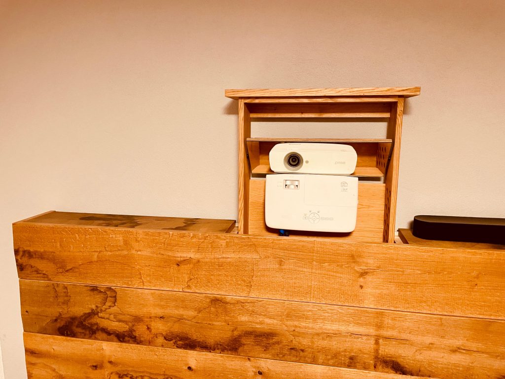 Das Bett ist nicht nur ein optisches Highlight, sondern auch funktional durchdacht –Aus dem Kopfteil kann per Smart Home ein Beamer herausfahren, Rolläden und Leinwand werden im Schlafzimmer heruntergefahren, das Licht dimmt sich ab.